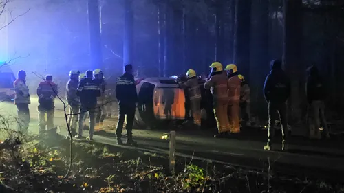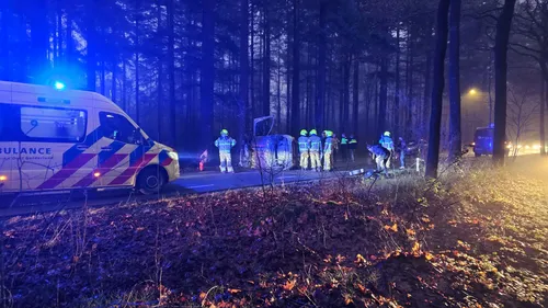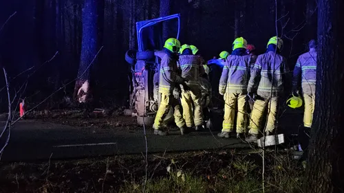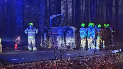 belandde op zijn zijkant na tegen een boom te zijn gereden. Hulpdiensten kwamen